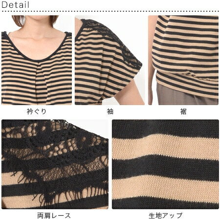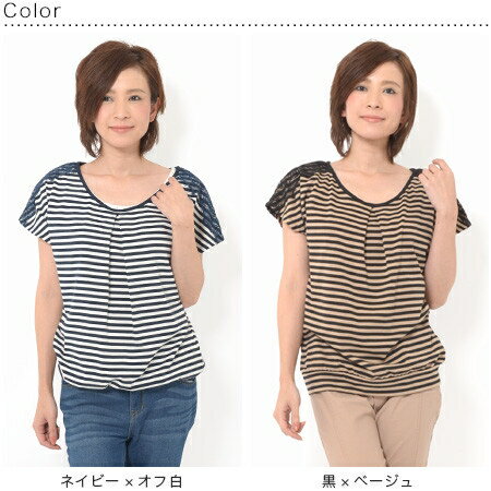 両肩のレースが大人エレガンスなポイント ボーダ—カットソーフロントに寄せたタックが、綺麗な立体感を生み出します。