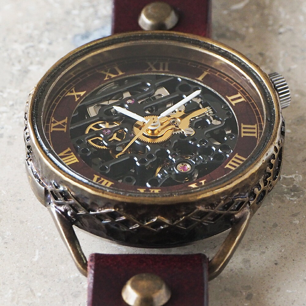 着用(男性・腕回り約17cm) メカニックな雰囲気がカッコいい! ギフトにもおススメな1点です シルバームーブメント仕様もご用意しております 画像をクリックするとページが移動します 機能・素材・サイズ 機能・素材 【ムーブメント】機械式・手巻き機能付オートマティック 【風防】 ガラス 【ケース】 真鍮 【裏蓋】 ステンレス・ガラス 【ベルト】 イタリア牛革(ワインブラウン・赤茶色) サイズ 【ケース】直径:約40mm/厚さ:約11.5mm 【ベルト】最大幅:約17mm/厚さ:約2.5mm 対応腕周り:最大約18.5cm/最小約12.5cm ※腕周り18.5cm以上をご希望の方は、お買い上げの際に、 備考欄にご希望サイズをご記入ください。